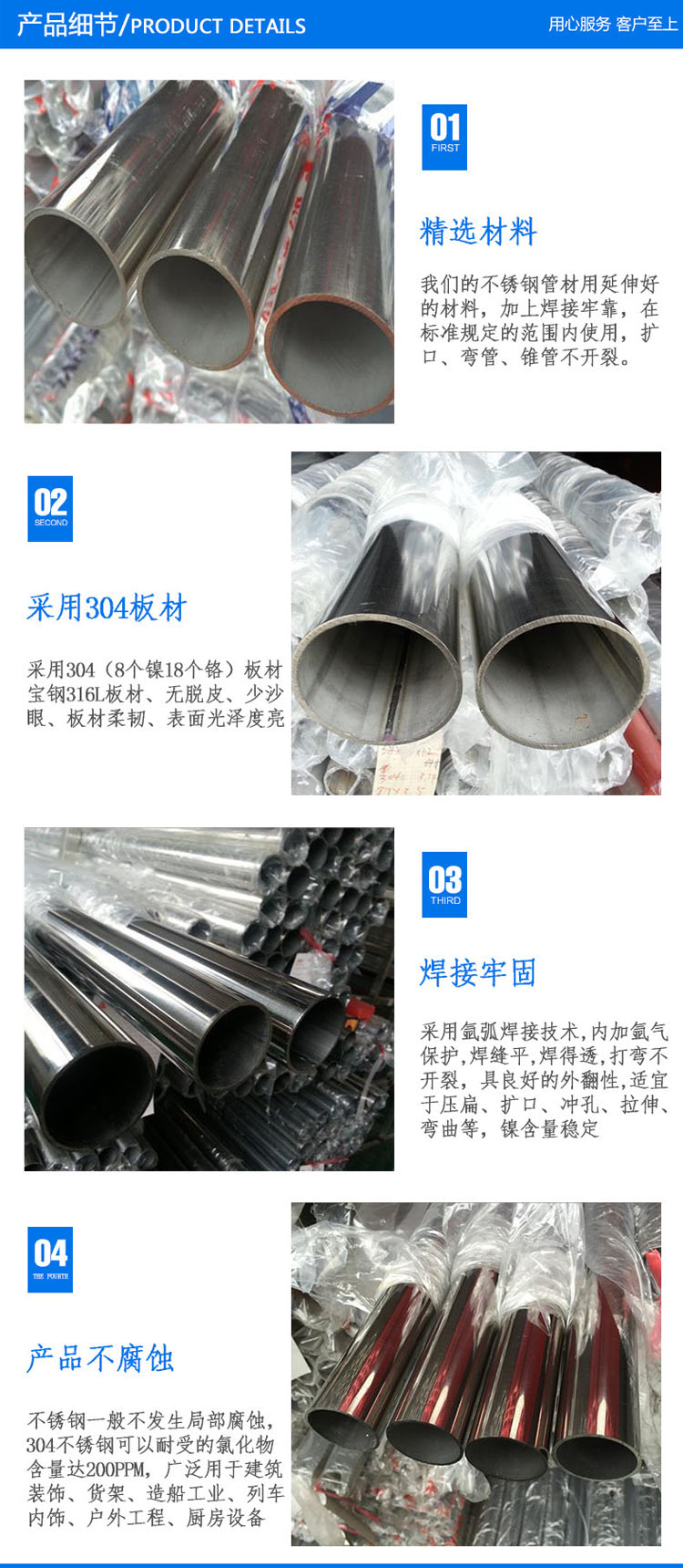 304不銹鋼管按橫斷面形狀可分為圓管和異形管。異形管有矩形管、菱形管、橢圓管、六方管、八方管以及各種斷面不對(duì)稱管等。異形管廣泛地用于各種結(jié)構(gòu)件、工具和機(jī)械零部件。與圓管相比,異形管一般都有較大的慣性矩和截面模數(shù),有較大的抗彎、抗扭能力,可以大大減輕結(jié)構(gòu)重量,節(jié)約鋼材。